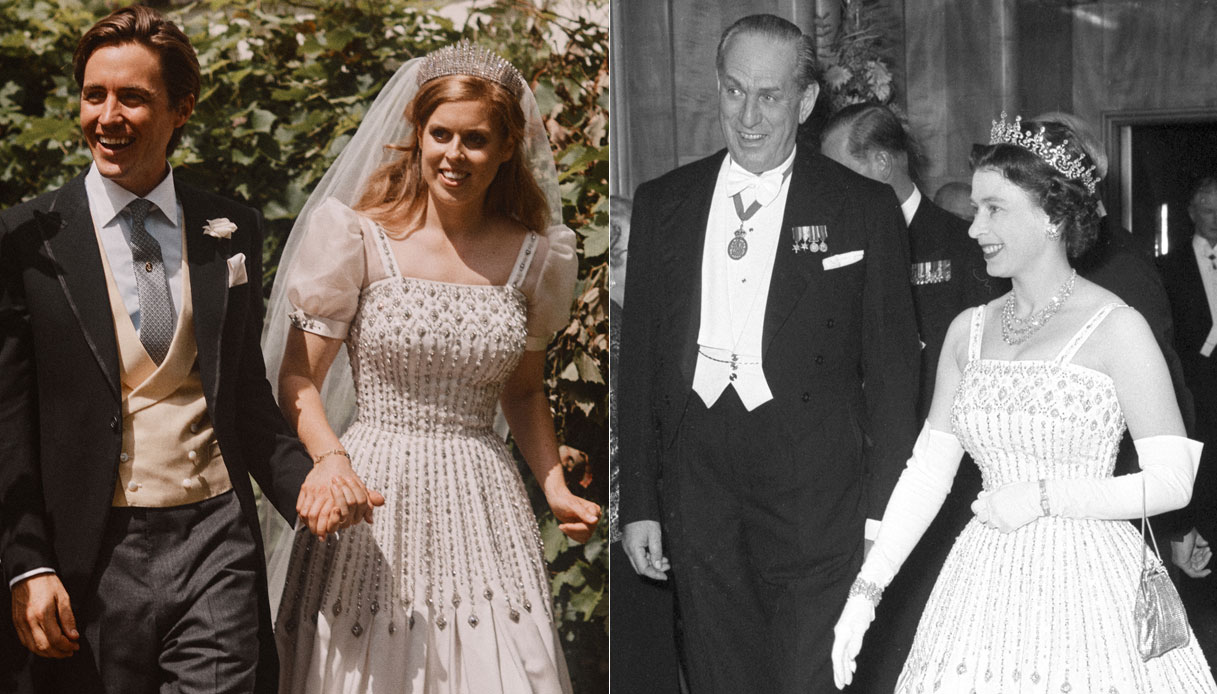 È stata la regina Elisabetta II a farle un regalo speciale e prezioso fornendole sia labito da sposa che la scintillante tiara di diamanti. Labito e la tiara prestati dalla regina. Beatrice di York labito da sposa di Norman Hartnell e le altre creazioni per la Regina Elisabetta editato in.